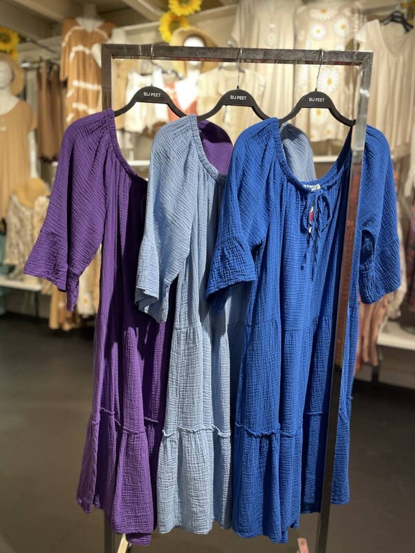 Mooie zomerjurken in een zachte katoenen stof. De kleuren zijn gewoon magnifique. Voor welke zou jij gaan? We hebben ze in het paars, jeans- en kobaltblauw, oranje, geel, framboos, zwart, wit, legergroen en camel. Genoeg keus dus! Ze zijn one size, draagbaar van maat 38 t/m 44. Het is een ruim model, dus zo vallen ze ook.